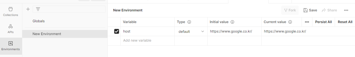 환경설정은 상단의 http://{{host}}/api/v1/message/sms 의 host 부분 예를들어 https://www.google.co.kr/ 와 같은 긴 주소를 API 테스트간 일일이 칠 필요 없이 미리 설정을 하는 기능이다.