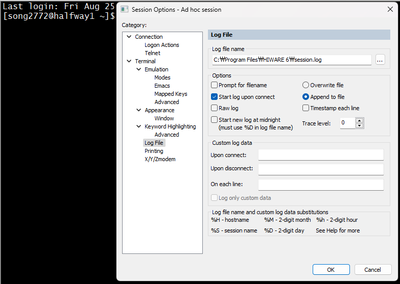 SecureCRT는 세션 중의 터미널 출력을 자동으로 로그 파일에 기록할 수 있습니다.